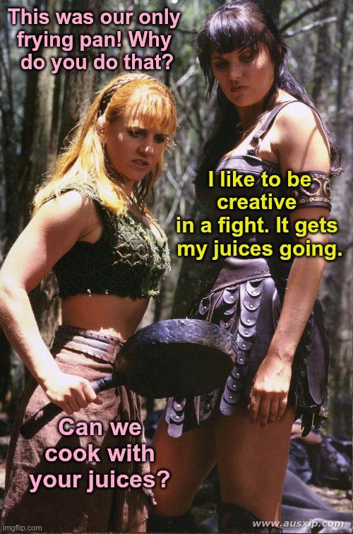 Xena: I didn’t mean it. Never judge a cook by her lover.